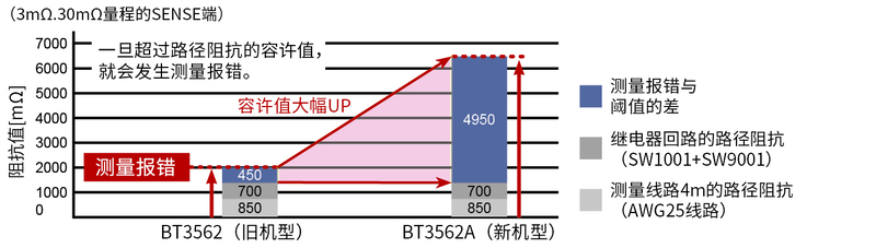 測(cè)量回路阻抗包括在構(gòu)建系統(tǒng)時(shí),所需的電纜與繼電器(測(cè)量多個(gè)電池時(shí)、測(cè)量?jī)x器與電池的連接將自動(dòng)切換)的配線阻抗以及探頭前端磨損所導(dǎo)致的接觸阻抗。這些路徑阻抗如果超過(guò)一定數(shù)值、就會(huì)發(fā)生測(cè)量報(bào)錯(cuò),引起生產(chǎn)線停止運(yùn)轉(zhuǎn)。為了構(gòu)建抑制路徑阻抗的系統(tǒng),需要花成本和時(shí)間、也影響現(xiàn)場(chǎng)作業(yè)。這次大幅改良了容許值,從了減少了路徑阻抗而引起的生產(chǎn)線暫停運(yùn)行的情況以及搭建的工時(shí),并大幅降低了維護(hù)成本。在大型自動(dòng)檢查系統(tǒng)中的表現(xiàn)尤為突出。